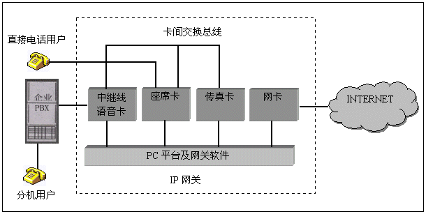 在PC機平臺內(nèi),可插入三種不同類型的語音卡,中繼卡用于連接企業(yè)原有的用戶交換機,使得分機用戶可以通過IP網(wǎng)絡(luò)接打電話,中繼線可采用模擬線或數(shù)字中繼線、座席卡用于直接連接電話用戶,常用于沒有用戶交換機的場合;傳真卡用于完成IP網(wǎng)絡(luò)上的傳真中繼功能。所有的語音卡之間采用卡間交換總線相連,以便實現(xiàn)互相通話和傳真資源共享。PC平臺內(nèi)一般還需要網(wǎng)卡實現(xiàn)與INTERNET的連接。網(wǎng)關(guān)軟件是該IP網(wǎng)關(guān)的關(guān)鍵部分,完成對語音卡的控制和IP協(xié)議處理。