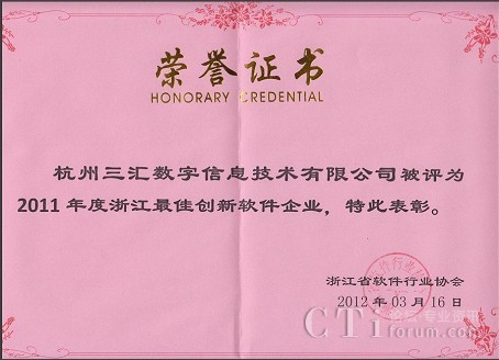 CTI論壇(ctiforum)3月23日消息(記者 浩宇): 2012年3月,浙江省軟件行業(yè)協(xié)會公布了2011年度浙江省軟件行業(yè)評優(yōu)結(jié)果。我們杭州三匯數(shù)字信息技術(shù)有限公司被評為“2011年度浙江最佳創(chuàng)新軟件企業(yè)”,同獲此殊榮的還有阿里巴巴、浙江中控、恒生電子、信雅達、?低、三維通信等其他9家國內(nèi)外知名的軟件企業(yè)。