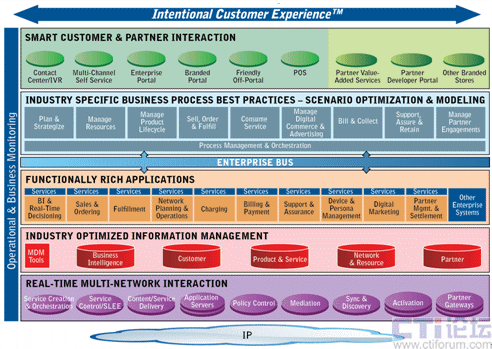 其次,CES改變了現(xiàn)有的業(yè)務應用層將功能和流程融合在一起的模式,對流程和功能進行了分離。實際上,應用功能和流程結(jié)合得越緊密,系統(tǒng)的適應性就會越差,對新業(yè)務和新產(chǎn)品的響應時間就越長,CES將業(yè)務應用層分為流程層和應用功能層,流程和功能的分離極大的提高了系統(tǒng)靈活性,降低了系統(tǒng)集成的復雜程度和成本開銷,滿足了新業(yè)務和新產(chǎn)品快速上市的要求。在流程層,運營商不僅可以選擇采用Amdocs在25年服務經(jīng)驗的基礎(chǔ)上總結(jié)的業(yè)界最佳實踐的業(yè)務流程,也可以選擇采用企業(yè)現(xiàn)有的業(yè)務流程;在應用功能層,Amdocs全系列軟件產(chǎn)品將更加模塊化,運營商可以選擇Amdocs全系列軟件產(chǎn)品,也可以選擇其中的個別或部分產(chǎn)品,這種高度模塊化的產(chǎn)品將以更快的速度集成到運營商已有的IT框架中。