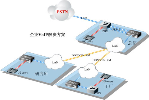 而目前網(wǎng)絡(luò)環(huán)境的改善,ADSL、寬帶的接入方式越來越普及,許多企業(yè)以及他們的分支機(jī)構(gòu)已經(jīng)通過各種方式接入Internet,鑒于Internet便宜的使用費(fèi)用,廣泛的普及范圍,基于VPN/DDN的VOIP解決方案,徹底解決了上述問題,彌補(bǔ)了傳統(tǒng)電話網(wǎng)關(guān)的不足,且用戶可以根據(jù)自己需要,不斷擴(kuò)展IP語音端口,"邊發(fā)展邊升級",經(jīng)濟(jì)靈活,是一套性價(jià)比非常高的方案。