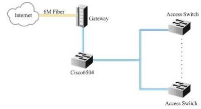 客房局域網(wǎng)通過一條6M的光纖接入CNC網(wǎng)絡(luò),網(wǎng)關(guān)設(shè)備承擔(dān)了DHCP、NAT和流量限制等功能,同時在思科6504上安裝有安全板卡,對內(nèi)部網(wǎng)絡(luò)安全進(jìn)行加強和防御。由于每個客房有2~3個信息點,客房局域網(wǎng)總共有1300個左右的信息點。