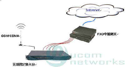 本方案采用FXO中繼語音網(wǎng)關(guān)接入互聯(lián)網(wǎng),由當(dāng)?shù)仄胀M電話線路落地對(duì)接網(wǎng)關(guān)FXO口,采用電話卡綁定網(wǎng)關(guān)預(yù)付費(fèi)計(jì)費(fèi)實(shí)現(xiàn)運(yùn)營(yíng)。落地線路接入可以使用本地固定PSTN線路,也可以轉(zhuǎn)制無線電話,采用固定臺(tái)接入,2種拓?fù)鋱D如下所示。