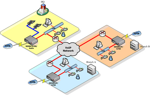 單個G700媒體網關提供長達1小時的語音宣告,可以用于公司問候語和其他各種語音提示一些辦公區(qū)域處于不同樓宇中,通過LAN的聯(lián)絡,4620 IP Phone和 IP softphone發(fā)揮了最大的靈活性和良好的使用感受。