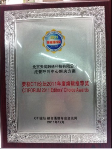 CTI論壇(ctiforum)1月13日消息(記者 潘婷婷): 近日, CTI論壇舉辦的“CTI論壇2011年度編輯推薦獎(jiǎng)”評選活動(dòng)落下帷幕,天潤融通的解決方案成功斬獲了CTI論壇編輯推薦獎(jiǎng)。