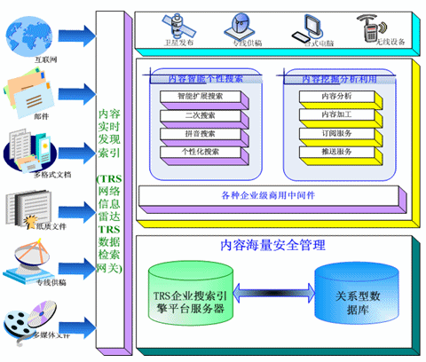 TRS公司推出的企業(yè)搜索引擎解決方案,利用TRS公司多年來自主開發(fā)的TRS Database Server作為企業(yè)搜索引擎服務(wù)的平臺(tái)。可以將電信企業(yè)內(nèi)外部多種格式、多種介質(zhì)形態(tài)、多種存儲(chǔ)方式的內(nèi)容信息,以實(shí)時(shí)的方式將這些信息進(jìn)行索引。并且在索引的過程中力求能夠做到準(zhǔn)確,并配合以相關(guān)智能語(yǔ)言技術(shù)做信息的去重、自動(dòng)標(biāo)引等能力。其框架如圖: