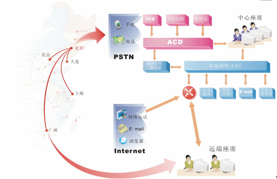 對于地區(qū)分布廣泛,而又要集中管理的企業(yè),可在各個局部地區(qū)設(shè)置遠端座席,并通過網(wǎng)絡(luò)方便的接入中心系統(tǒng)。我們?yōu)檫h端座席提供與中心座席完全相同的操作,遠端座席可以根據(jù)各個地區(qū)的特定情況有針對性的處理各個局部地區(qū)的業(yè)務(wù),為中心分流壓力,同時中心系統(tǒng)也可以完全掌握遠端座席的情況。我們可以非常明確的一點是:采用分布式座席的技術(shù),使得遠端座席與中心座席除了地域上的差異,其它部分完全相同?梢哉f只要網(wǎng)絡(luò)無極限,座席分布就是無極限的。