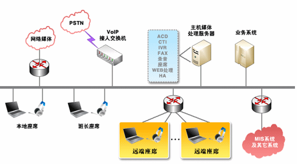 我們可以非常明確的一點是:采用分布式座席的技術(shù),使得遠(yuǎn)端座席與中心座席除了地域上的差異,其它部分完全相同。可以說只要網(wǎng)絡(luò)無極限,座席分布就是無極限的。