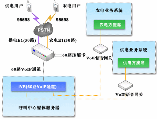 由于要保證供、農(nóng)電統(tǒng)一95598號碼的接入,呼叫中心系統(tǒng)采用供、農(nóng)電合一的方式,建立統(tǒng)一的呼叫中心系統(tǒng),并保證系統(tǒng)接入容量及其他資源能夠滿足統(tǒng)一的要求;在自動語音菜單中,分別設(shè)立供、農(nóng)電用戶層,用戶可以自行區(qū)分、選擇進(jìn)入相應(yīng)的導(dǎo)航菜單中,確認(rèn)之后,系統(tǒng)默認(rèn)記錄該用戶的類型,再次呼叫時,系統(tǒng)自動識別該用戶供、農(nóng)電類型;在確認(rèn)了用戶類型之后,用戶選擇轉(zhuǎn)接人工座席時,自動進(jìn)入相應(yīng)的供電座席組或者農(nóng)電座席組,并且,在確定轉(zhuǎn)接錯誤分組之后,可以由座席進(jìn)行再次轉(zhuǎn)接。