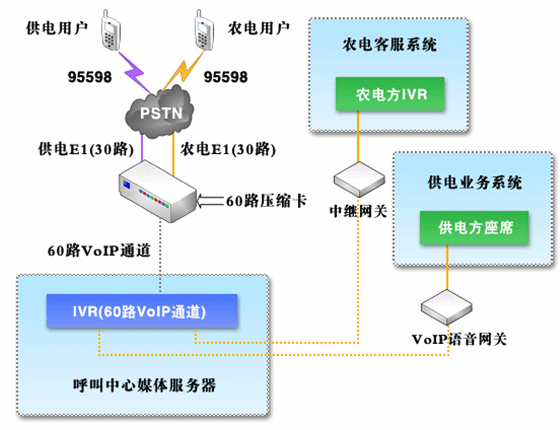 對于呼叫中心系統(tǒng),由95598特別號碼統(tǒng)一接入,并且在供電呼叫中心系統(tǒng)與農(nóng)電呼叫中心系統(tǒng)之間采用中繼方式(模擬中繼或者數(shù)字中繼,視農(nóng)電方實際情況而定)進(jìn)行話路連接,同時保證系統(tǒng)接入容量及其他資源能夠滿足統(tǒng)一的要求;在自動語音菜單中,分別設(shè)立供、農(nóng)電用戶層,用戶可以自行區(qū)分、選擇,對于農(nóng)電用戶在確定用戶類型之后,通過中繼將話路轉(zhuǎn)接到農(nóng)電方呼叫中心系統(tǒng)。