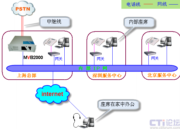在技術上,MVB2000 的語音業(yè)務通過電信運營商的模擬或者數字中繼線路接入,數據業(yè)務都通過局域網或者互聯網使用TCP/IP協議傳送,解決了呼叫中心中大量數據傳送的需求,請看下面的網絡組織結構圖: