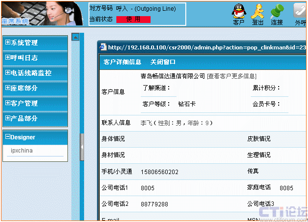 當客戶來電轉接人工服務時,自動彈出信息登記窗口并根據來電號碼檢查客戶資料庫中是否有該客戶的數據。如客戶的名稱、地址、聯系電話、身體狀況、膚色、以往的咨詢、投訴等記錄信息。以及來電日期、時間、受理人等;使座席人員一目了然,第一時間了解來電的相關信息。