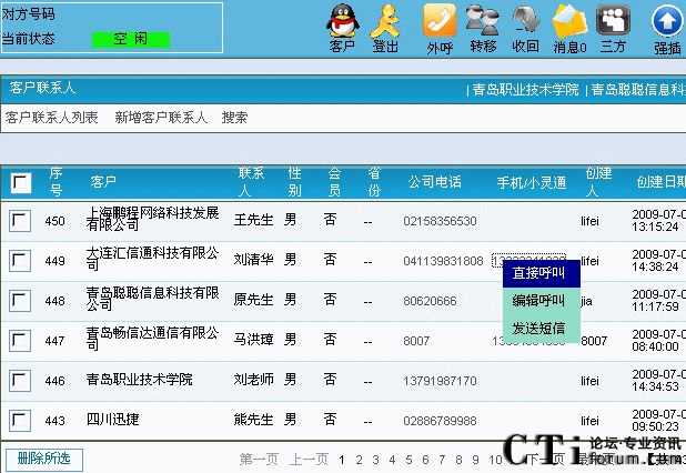 9. 外呼功能:座席人員可以選擇并點(diǎn)擊已有的聯(lián)系人、客戶的電話號(hào)碼,系統(tǒng)便自動(dòng)外呼并接通座席電話,座席人員也可以手工輸入對方號(hào)碼,點(diǎn)擊外呼。