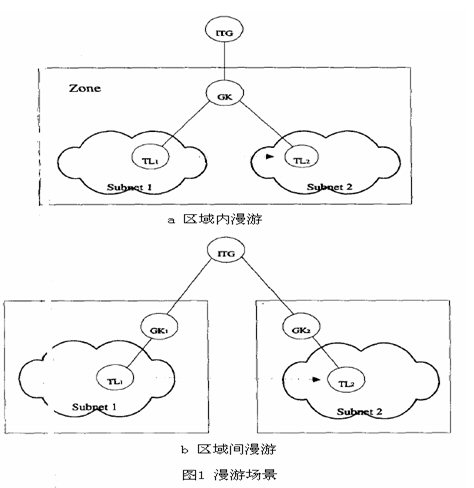 H.323定義中,區(qū)域指由H.323實(shí)體(終端、ITG、MCU)組成的集合,并由一個(gè)網(wǎng)守進(jìn)行管理。每一個(gè)區(qū)域只有一個(gè)網(wǎng)守,但允許多個(gè)子網(wǎng)通過(guò)路由器連接進(jìn)來(lái)。對(duì)于這種多子網(wǎng)單網(wǎng)守的特性,我們發(fā)現(xiàn)這與GSM系統(tǒng)中的服務(wù)區(qū)類似,網(wǎng)守就相關(guān)于HLR或者VLR。服務(wù)區(qū)中有移動(dòng)電話終端和代理管理下的基站,類似的一個(gè)區(qū)域中有多個(gè)子網(wǎng)并都在一個(gè)網(wǎng)守的管理下。當(dāng)移動(dòng)IP電話從一個(gè)子網(wǎng)漫游到另外一個(gè)子網(wǎng)時(shí),IP電話的IP地址就發(fā)生了變化。如果不做移交處理的話,連接將中斷。