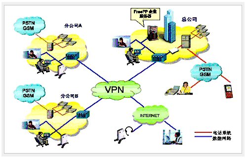 FreePP獨有的群組功能可以幫助企業(yè)將其總部與分支機(jī)構(gòu)原本各自獨立的若干個PBX整合成為一個PBX,實現(xiàn)Internet、PSTN網(wǎng)絡(luò)上通信應(yīng)用的融合,幫忙企業(yè)擺脫對傳統(tǒng)通信運(yùn)營商的依賴,完全掌握自己的通信網(wǎng)絡(luò)。通過為PBX外線上的若干個FreePP Box (或MPES)分配一個Group Number,PBX內(nèi)線上的分機(jī)按照PBX上的設(shè)定來獲取Group Number中的一個FreePP Box,進(jìn)而通過這個FreePP Box來呼叫另外一組Group Number 連接的PBX分機(jī)號碼。他們相互間的通信完全基于Internet實現(xiàn),無需象傳統(tǒng)方式那樣交納通信費(fèi)用。