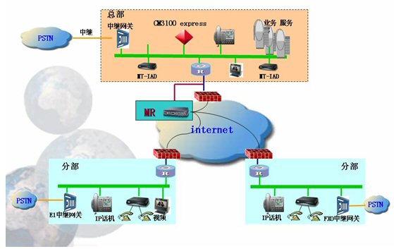 由于電信運(yùn)營商的線路租賃費(fèi)用非常昂貴,對于中小企業(yè)來說是一項(xiàng)不小的負(fù)擔(dān),所以中小企業(yè)的組網(wǎng)方式一般采用ADSL方式,來降低費(fèi)用,而ADSL的組網(wǎng)方式往往都經(jīng)過了幾層地址轉(zhuǎn)換了,這樣在分部或分支機(jī)構(gòu)的IP電話終端就無法穿透防火墻,實(shí)現(xiàn)和外面成功通話,所以需要在總部配置1臺(tái)媒體路由器(MR)來做語音代理,完成呼叫連接的建立。