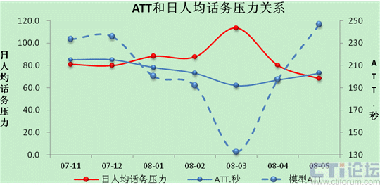 若ATT只受話務壓力影響,兩者關(guān)系應出現(xiàn)下圖虛線描述的模型ATT形狀,而事實ATT的波幅相對小很多,說明ATT還受到其它諸多因素的制約。(圖1)