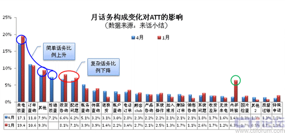 為了分析“話務構(gòu)成”和“業(yè)務周期”影響ATT的關(guān)聯(lián)性,我們還是取08年1月和4月的來話小結(jié)分布比例占前5位的數(shù)據(jù),進行參考分析:(下圖11)