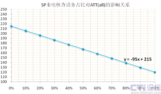 我們把話務構(gòu)成簡單化,假設(shè)只有“來電核查”和“Inbound”兩大隊列,在上下6%的波動范圍內(nèi),取ATT(sp)=120秒,ATT(in)=215秒,“SP來電核查”話務占比=x,則“Inbound”話務占比=1-x,ATT(all)=y(tǒng),整體通話均長y與“SP來電核查”話務占比x存在如下線性關(guān)系:(下圖13)