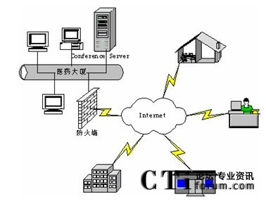 視頻會議服務器設置在上?偛浚ㄟ^電信的6M帶寬接入互聯網,并配備有廣域網靜態(tài)IP地址。下屬生產基地和分支機構通過電信ADSL接入和光纖接入等方式接入互聯網。這些點能夠實現網絡視頻會議通訊,進行音頻、視頻和數據的多方溝通。