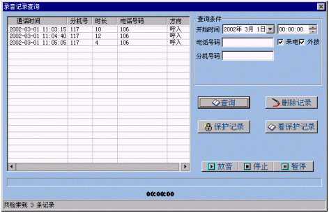 根據(jù)該操作員的類別判定該操作員具有那些權(quán)限(查詢、管理、監(jiān)聽等),具備查詢權(quán)限的操作員可以按時間、分機(jī)號、來去點號碼等來查詢所有的錄音信息;具備管理權(quán)限的操作員可以進(jìn)行操作員管理以及對系統(tǒng)相關(guān)參數(shù)的設(shè)置;具備監(jiān)聽權(quán)限的操作員可以監(jiān)聽其他坐席的實時狀態(tài)。