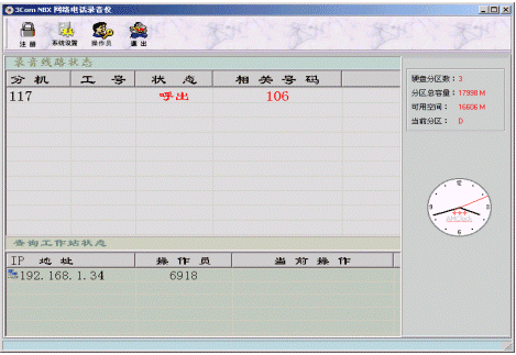 錄音坐席為網(wǎng)音公司開發(fā)的基于3Com NBX wavphone的軟件電話,與pcXset功能基本相同,能實現(xiàn)外撥、應(yīng)答、掛機(jī)、電話會議、呼叫轉(zhuǎn)移、呼叫保持等常用功能。