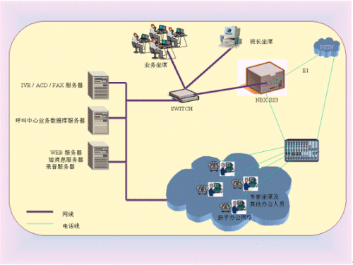 NBX SS3 網(wǎng)絡(luò)電話交換機(jī)作為基礎(chǔ)通信平臺(tái),由北大方正電子技術(shù)有限公司在北京網(wǎng)音公司呼叫中心中間件進(jìn)行集成開(kāi)發(fā),建立CTI,ACD、IVR、FAX、TTS及其應(yīng)用服務(wù),集成現(xiàn)有的WEB、mail、短消息系統(tǒng),建立統(tǒng)一消息平臺(tái),新建和利用各業(yè)務(wù)數(shù)據(jù)庫(kù),設(shè)計(jì)業(yè)務(wù)坐席及客戶端軟件。