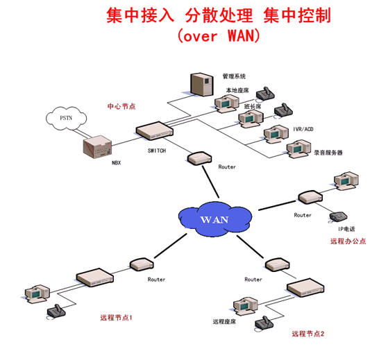 VoIP 技術(shù)與呼叫中心的結(jié)合,不僅僅讓用戶享受到Internet帶來的大量話費(fèi)的節(jié)約,更使基于Internet連接的分布式呼叫中心成為可能。分布式的呼叫中心系統(tǒng),集中式的管理,才能真正滿足那些擁有多個(gè)分支機(jī)構(gòu)的行業(yè)和企業(yè)用戶建設(shè)呼叫中心的需求;贗P分布式的NBX呼叫中心平臺(tái)支持遠(yuǎn)端坐席,利用現(xiàn)有的企業(yè)專線實(shí)現(xiàn)分布呼叫,同時(shí)簡(jiǎn)化管理,由于人工坐席技能差異、語(yǔ)言差異、呼叫量的差異,以及客戶中心客戶所在地的變化及每個(gè)客戶對(duì)各自所擁有的用戶資料的保密性需求,分布式呼叫中心往往更適合各類企業(yè)的實(shí)際。分布式呼叫中心的建立,意味著需要在多個(gè)分中心之間進(jìn)行統(tǒng)一的呼叫控制及語(yǔ)音與同步數(shù)據(jù)轉(zhuǎn)移。NBX作為IP-PBX的引入,兩網(wǎng)合一的特性使分布式呼叫中心的建立成為了一件非常容易的事情。呼叫中心可以擴(kuò)展到多個(gè)位于不同地域的局域網(wǎng)上,通過路由選擇可以自動(dòng)地把呼叫(語(yǔ)音)和數(shù)據(jù)從一個(gè)地點(diǎn)轉(zhuǎn)到另一個(gè)地點(diǎn)中心,因?yàn)檎Z(yǔ)音數(shù)據(jù)通過同一網(wǎng)絡(luò),語(yǔ)音和數(shù)據(jù)同步轉(zhuǎn)移是很自然的。由于數(shù)據(jù)和語(yǔ)音全部通過以太網(wǎng)傳輸,所以不用支付昂貴的長(zhǎng)途話費(fèi),降低了企業(yè)及客戶的開銷,同時(shí)由于各分支機(jī)構(gòu)可將各自的客戶資料保存在各分中心,這樣不僅大大降低了呼叫中心對(duì)數(shù)據(jù)庫(kù)的維護(hù)管理工作,也節(jié)約了設(shè)備投入及運(yùn)營(yíng)維護(hù)成本。