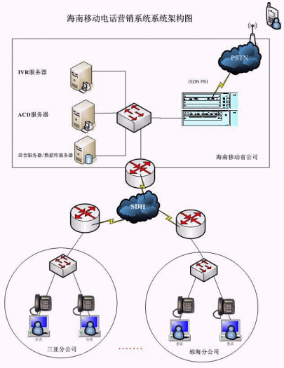 此次為電話營銷系統(tǒng)一期工程,在省公司部署一套NBX V5000系統(tǒng)及相應的CTI服務器,通過2條E1接入PSTN,在18個地市直接部署50個IP電話終端及坐席端軟件,語音走移動已有的MDCN網(wǎng)絡,一個集中受理分布處理的呼叫中心系統(tǒng)就建設起來啦,本次工程從設備到貨、系統(tǒng)上線試運行,僅僅用了1個星期,我們海南移動公司的項目經(jīng)理都驚訝的說"太快啦啦,要是使用傳統(tǒng)的排隊機部署一個分布全省的類似系統(tǒng),少說工期也得幾個月"。經(jīng)過1個月的試運行,系統(tǒng)運行穩(wěn)定,各項系統(tǒng)指標滿足合同要求,在11月份系統(tǒng)順利通過初驗。