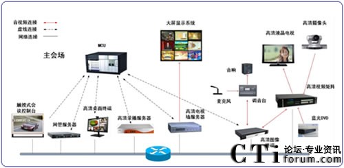 其中迪威高清視頻會議系統(tǒng)主要由:一臺高清MCU、10個高清硬件終端、18個高清桌面終端、一臺高清錄播服務(wù)器以及一個網(wǎng)管系統(tǒng)組成。如圖所示: