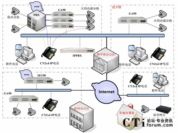 具體情況是:和平里的總部與沙河辦公區(qū)之間為網(wǎng)絡(luò)專線,并有公網(wǎng)出口。各辦事處使用ADSL撥號上網(wǎng)方式。總部的方案設(shè)計中,使用了5臺GA90網(wǎng)關(guān),兩臺IPPBX以及多部IP話機(jī)和軟件電話。和平里辦公區(qū)工位數(shù)量為120左右,其中多數(shù)工位需要部署模擬話機(jī),個別工位屬于非固定的移動工位,需要部署CN2x4