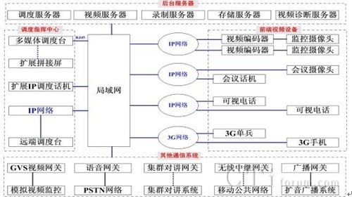 如上圖所示,整體解決方案由后臺服務(wù)器群、指揮中心操作臺、前端視頻設(shè)備、其他語音通信系統(tǒng)等幾部分組成,系統(tǒng)基于IP網(wǎng)絡(luò)部署,所有設(shè)備均直接接入到IP網(wǎng)絡(luò)上,通過IP網(wǎng)絡(luò)匯聚到指揮中心進(jìn)行交換和統(tǒng)一管理調(diào)度。