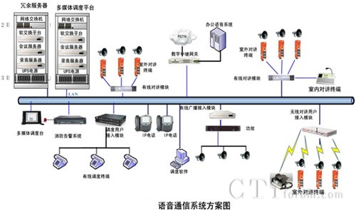 整體解決方案由軟交換服務(wù)器、會(huì)議服務(wù)器、錄音服務(wù)器、數(shù)字中繼網(wǎng)關(guān)、調(diào)度臺(tái)、有線對(duì)講模塊、有線廣播模塊、無(wú)線對(duì)講模塊等幾部分組成,系統(tǒng)基于IP網(wǎng)絡(luò)部署,所有設(shè)備均直接接入到IP網(wǎng)絡(luò)上,通過(guò)IP網(wǎng)絡(luò)匯聚到指揮中心進(jìn)行交換和統(tǒng)一管理調(diào)度。