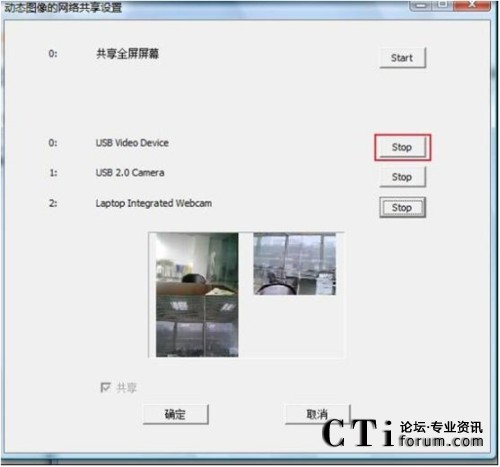 打開(kāi)動(dòng)態(tài)圖像網(wǎng)絡(luò)共享圖像設(shè)置列表,可以看到共享全屏屏幕下面有3個(gè)不同的顯示,這表示在這臺(tái)電腦上一共插了3個(gè)攝像機(jī),點(diǎn)擊顯示欄右側(cè)的“start”,就可以把攝像機(jī)的圖像設(shè)置為共享的圖像,這3個(gè)攝像機(jī)可以同時(shí)共享,也可以只設(shè)置其中的某一個(gè)。點(diǎn)擊“start”后按鈕就會(huì)變?yōu)椤皊top”,這時(shí)攝像機(jī)所獲取到得圖像也會(huì)在列表中顯示。下圖是將3個(gè)攝像機(jī)都設(shè)為共享的圖像的效果: