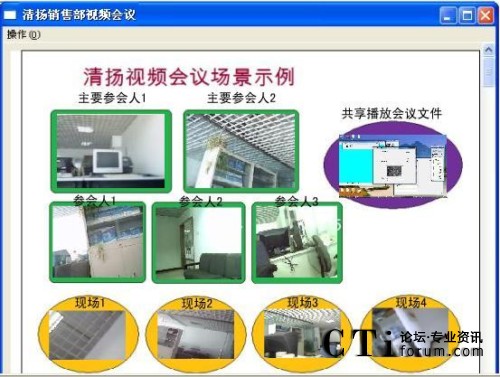簡單的操作以后,一個生動的會議場面就出現(xiàn)在眼前。效果如圖一所示。軟件屏幕墻的使用讓每個參會人又重新找回了聚在了一個會議室里進(jìn)行會議的感覺。 具體的操作請參見用戶手冊會議屏幕墻的使用。