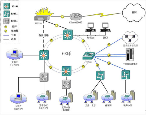 此城域網(wǎng)結(jié)構(gòu)清晰,由核心層的三層交換機(jī)只負(fù)責(zé)數(shù)據(jù)的快速轉(zhuǎn)發(fā),對業(yè)務(wù)匯聚和用戶的認(rèn)證控制任務(wù)全部由接入服務(wù)器R4000來完成。要求接入服務(wù)器支持多種認(rèn)證手段、加強(qiáng)對各類用戶實現(xiàn)不同級別的控制、為用戶的訪問提供安全保障措施、結(jié)合Radius系統(tǒng)提供多種計費(fèi)功能。
