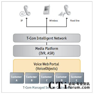 T-Com是德國電信公司(DTAG)固話和寬帶部門,承擔運營商網(wǎng)絡的全部職責,并且銷售和服務著四千萬居民用戶。T-Com的增值業(yè)務中心作為受托管理業(yè)務提供商(MSP)進行運作,提供基于網(wǎng)絡的呼叫中心業(yè)務,例如網(wǎng)絡IVR、主叫標識和網(wǎng)絡ACD。T-Com的MSP客戶包括T-Com的內(nèi)部呼叫中心和一百多個外部企業(yè)客戶,其中很多是T-Com特有的免費業(yè)務號碼基地。這些企業(yè)客戶——比如大型有限電視提供商、家庭購物實體、公共機構象市政府和政府機構、大型郵購公司、銀行和保險公司——往往擁有需要集中管理的部門內(nèi)部自助服務電話應用。