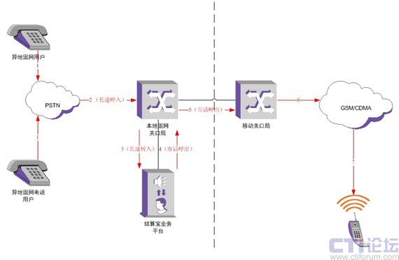 異地本網(wǎng)(例如太原鐵通)用戶呼叫本地移動(例如杭州移動)用戶,系統(tǒng)會經(jīng)過杭州的關(guān)口局將該呼叫送至移動的關(guān)口局。結(jié)算寶業(yè)務(wù)平臺掛接在本地關(guān)口局上,攔截這類呼叫,并將長途號碼替換為本地號碼,然后通過本地關(guān)口局轉(zhuǎn)呼出去。