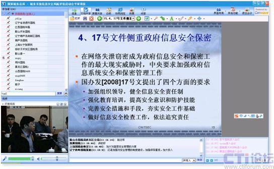 CTI論壇(ctiforum)05月07日消息: 4月8日-9日國家稅務(wù)總局組織全國省國稅地稅局IT主任與解放軍總參三院、中國信息安全評(píng)測中心、神州網(wǎng)御70多人在濟(jì)南錦繡山莊以及全國各地國稅地稅相關(guān)人員200多人使用自己辦公室的電腦通過盛維(Cenwave)新世紀(jì)提供的網(wǎng)絡(luò)視頻直播系統(tǒng)召開“國家稅務(wù)系統(tǒng)信息安全風(fēng)險(xiǎn)評(píng)估啟動(dòng)會(huì)”。此次會(huì)議是國家稅務(wù)總局首次租用網(wǎng)絡(luò)視頻會(huì)議直播系統(tǒng)召開全國性會(huì)議也是參會(huì)人數(shù)最多的一次,不僅打破地點(diǎn)人數(shù)的限制、克服了硬件設(shè)備的局限、節(jié)省行政成本,也是建設(shè)“兩型社會(huì)”的具體體現(xiàn)。