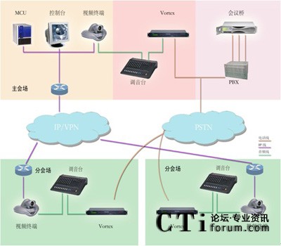 系統(tǒng)基于PSTN電話網(wǎng)絡(luò), 在視頻會議系統(tǒng)中心會場配備一套POLYCOM VORTEX EF2241與會場調(diào)音臺聯(lián)結(jié),并根據(jù)會場數(shù)量配備一套相應(yīng)方數(shù)的音頻會議橋,各分會場分別配備一套POLYCOM VORTEX EF2211與會場調(diào)音臺聯(lián)結(jié),如用戶無線路條件,也可使用當(dāng)?shù)剡\(yùn)營商的電話會議平臺。