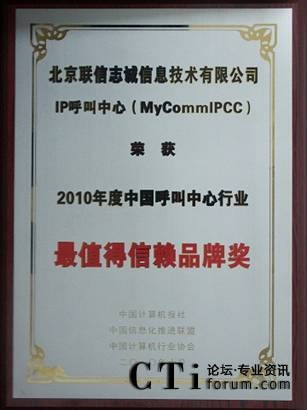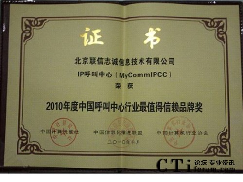 CTI論壇(ctiforum)11月1日消息(記者 潘婷婷):近日,在國家信息化專家咨詢委員會的指導(dǎo)下,作為中國信息化發(fā)展重要推動力量的中國計算機報社、中國計算機行業(yè)協(xié)會、中國信息化推進聯(lián)盟等國家級權(quán)威媒體及國家信息化領(lǐng)域一級權(quán)威機構(gòu),共同組織開展“2010中國行業(yè)信息化讀者選擇獎評選”,重點展示信息化在行業(yè)應(yīng)用中的優(yōu)秀應(yīng)用案例、產(chǎn)品及解決方案。由中國計算機報社組織業(yè)內(nèi)專家,在經(jīng)過歷時3個月的產(chǎn)品征集、方案論證、專家評審后,北京聯(lián)信志誠信息技術(shù)有限公司(簡稱MyComm公司),其核心產(chǎn)品MyCommIPCC獨占2010年中國呼叫中心行業(yè)最值得信賴品牌獎。