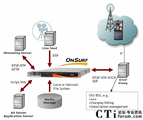 流媒體服務(wù)器(OnSurf) 使用RSTP等實(shí)時(shí)傳輸協(xié)議與客戶端進(jìn)行媒體服務(wù)協(xié)商,向用戶發(fā)送媒體流,服務(wù)器同時(shí)包含語(yǔ)音和視頻轉(zhuǎn)碼器,用于各種音視頻媒體格式的轉(zhuǎn)換。