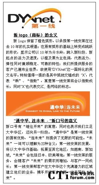 CTI論壇(ctiforum)08月20日消息: 知名網(wǎng)絡(luò)服務(wù)商第一線安萊,十年間憑借經(jīng)驗(yàn)豐富的團(tuán)隊(duì),靈活的服務(wù)、可靠的網(wǎng)絡(luò)系統(tǒng)等,遙遙領(lǐng)先于眾多競(jìng)爭(zhēng)對(duì)手,傲然屹立于大中華地區(qū)。目前,正值第一線安萊十周年慶之際,全新的企業(yè)商標(biāo)和“通中華.連未來”的新口號(hào)也向大眾展示。公司提出將幫助客戶實(shí)現(xiàn)“立足大中華,拓展全世界”的愿景。