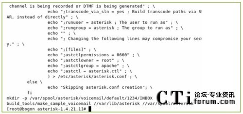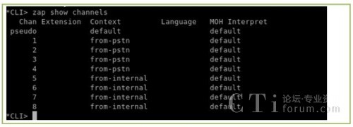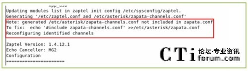 下圖為運(yùn)行上述命令的輸出,從輸出我們可以發(fā)現(xiàn)一個問題,(使用本文的所用的軟件版本可能會出現(xiàn)的一個問題,其他的版本不一定會出現(xiàn)),/etc/asterisk/zapata-channels.conf