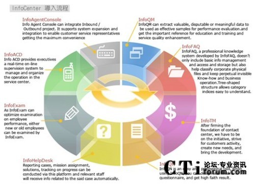 由于今日的客服中心已是多媒體的客服中心,不再只有單純的電話進線,客戶尋求服務(wù)的管道更多樣化,InfoCenter Total Solution可以完全整合應(yīng)用程序、數(shù)據(jù)倉儲系統(tǒng)、多媒體溝通互動管道,藉由不同的系統(tǒng)達到分析與處理客戶需求,并且達到一致性的工作流程管理,提供更高質(zhì)量的服務(wù)。