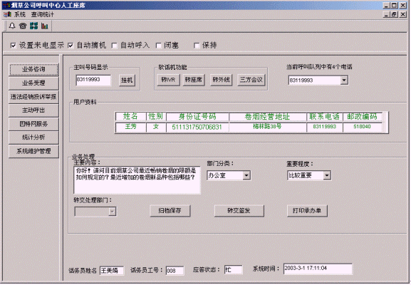 客戶打入電話后,當系統(tǒng)的自動語音應答子系統(tǒng)無法解決客戶問題時,客戶可選擇人工服務,由企業(yè)客戶服務代表直接接聽客戶電話,處理并解決客戶問題。此時客戶同座席話務人員直接溝通,并同時記錄下該客戶的聯(lián)系方式,將相關數(shù)據(jù)添加入系統(tǒng)數(shù)據(jù)庫;也可以在數(shù)據(jù)庫的支持下回答接受查詢卷煙/價格/限額/新品種、卷煙經(jīng)營規(guī)范制度/卷煙專賣政策法規(guī)咨詢、通報最近暢銷卷煙的限額情況/通報最近增加的新品種/煙草公司召集的活動通知、投訴和舉報違法經(jīng)銷行為、卷煙預訂、電話訪銷、滿意度調(diào)查等。