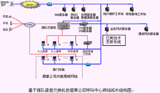 該煙草公司呼叫中心主要是由語音交換機、CTI服務器、IVR(交互式語音應答)/IFR(交互式傳真應答)子系統(tǒng)、人工座席子系統(tǒng)、應用服務器、數(shù)據(jù)庫服務器、業(yè)務網(wǎng)關子系統(tǒng)、通信網(wǎng)關子系統(tǒng)等硬件設備和應用軟件組成。