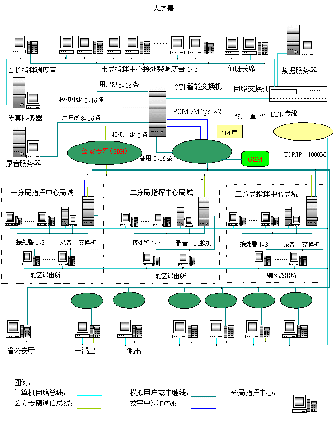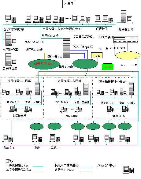 - 樹立大網(wǎng)絡(luò)概念:采用先進(jìn)的通訊、計(jì)算機(jī)網(wǎng)絡(luò)技術(shù)(采用CTI可編程交換技術(shù)),利用現(xiàn)有的通信資源,實(shí)現(xiàn)市局指揮中心與消防大隊(duì)、交警大隊(duì)、各派出所的計(jì)算機(jī)網(wǎng)絡(luò)及相關(guān)領(lǐng)導(dǎo)辦公室計(jì)算機(jī)大聯(lián)網(wǎng);形成全市范圍內(nèi)110、119、122有線、無(wú)線全方位立體調(diào)度語(yǔ)音通道大網(wǎng)。
