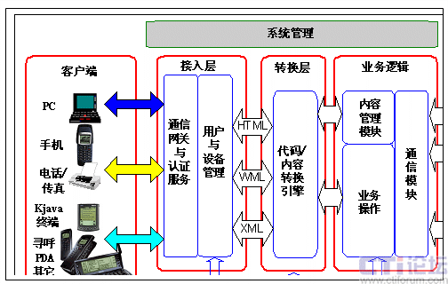 系統(tǒng)支持多種接入設(shè)備,包括廣泛使用的Web瀏覽器、支持WAP或HDML的移動(dòng)電話(huà)、支持Kjava的移動(dòng)終端、基于PalmOS或WinCE的PDA(個(gè)人數(shù)字助理)、傳統(tǒng)的移動(dòng)電話(huà)和尋呼等,并可以方便對(duì)于未來(lái)的接入設(shè)備進(jìn)行定制。