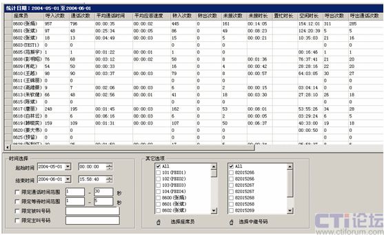 “系統(tǒng)”平臺(tái)可實(shí)現(xiàn)對(duì)整個(gè)電話(huà)咨詢(xún)的實(shí)時(shí)監(jiān)控,可以獲得任意一段時(shí)間內(nèi)中繼線(xiàn)的使用情況、座席的使用情況及工作狀態(tài)、進(jìn)出隊(duì)列等,通過(guò)多種圖示、詳細(xì)數(shù)據(jù)報(bào)表,可以找出一天、一周或一個(gè)月內(nèi)呼入總量、瞬間呼入峰值、呼入量分布特點(diǎn)等,從而合理地系統(tǒng)資源和值班人員,在緊急時(shí)間可適當(dāng)?shù)卦鰷p中繼線(xiàn)、座席、IVR端口的數(shù)量,確保系統(tǒng)運(yùn)行最為經(jīng)濟(jì),合理;還可以通過(guò)座席員接打電話(huà)情況報(bào)表,對(duì)座席員進(jìn)行科學(xué)的考評(píng)。