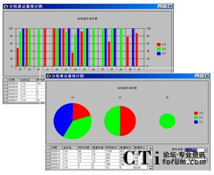 從類別上看,多種業(yè)務(wù),不論種類如何,都可以劃為一類;多個座席可以劃為另一類。因此,同類合在一起,以同樣的圖形表示,就可以作出直觀比較。如二個從事同一業(yè)務(wù)的座席的接通率比較就非常有意義